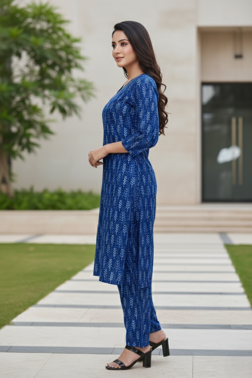 A simple and elegant kurti-pant set with a relaxed fit, perfect for a clean, minimal, and comfortable everyday look.