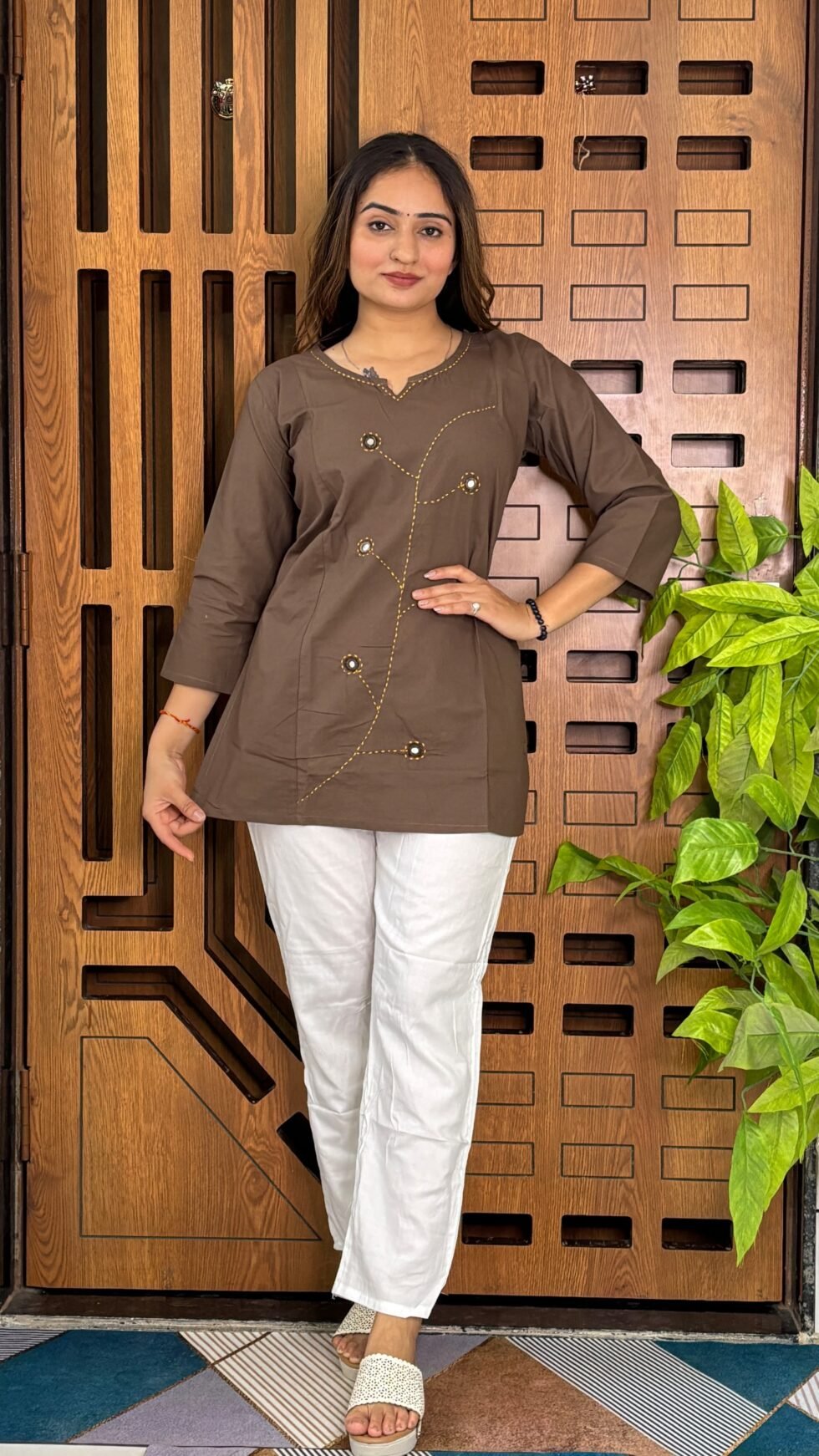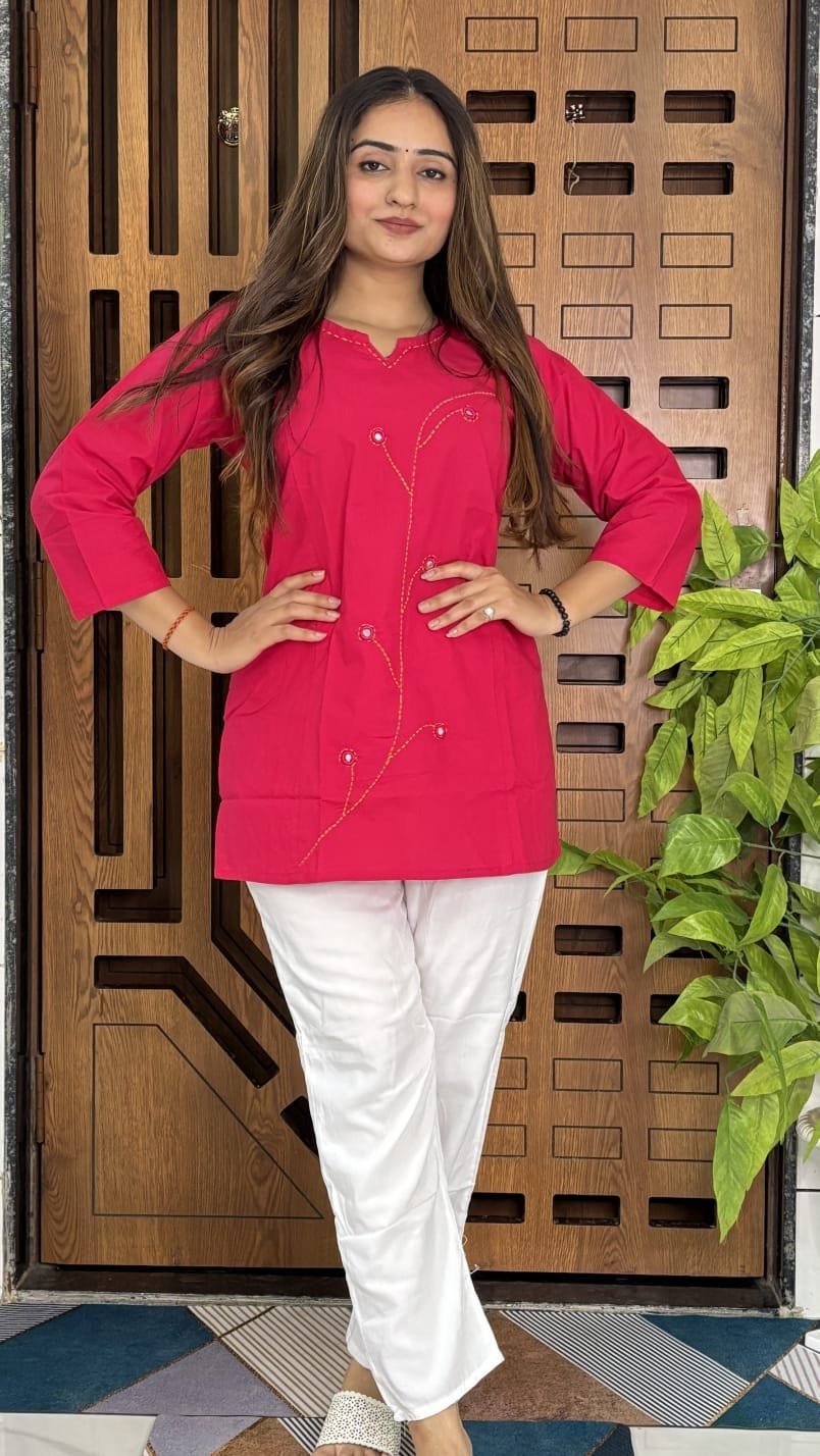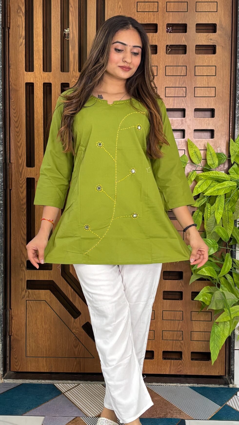 This collection features a versatile A-line short top crafted from breathable premium cotton, designed for both comfort and style. Each piece is elevated by a hand-embroidered floral vine featuring authentic mirror-work (Abhla Bharat) that adds a touch of traditional Indian craftsmanship to a modern silhouette.